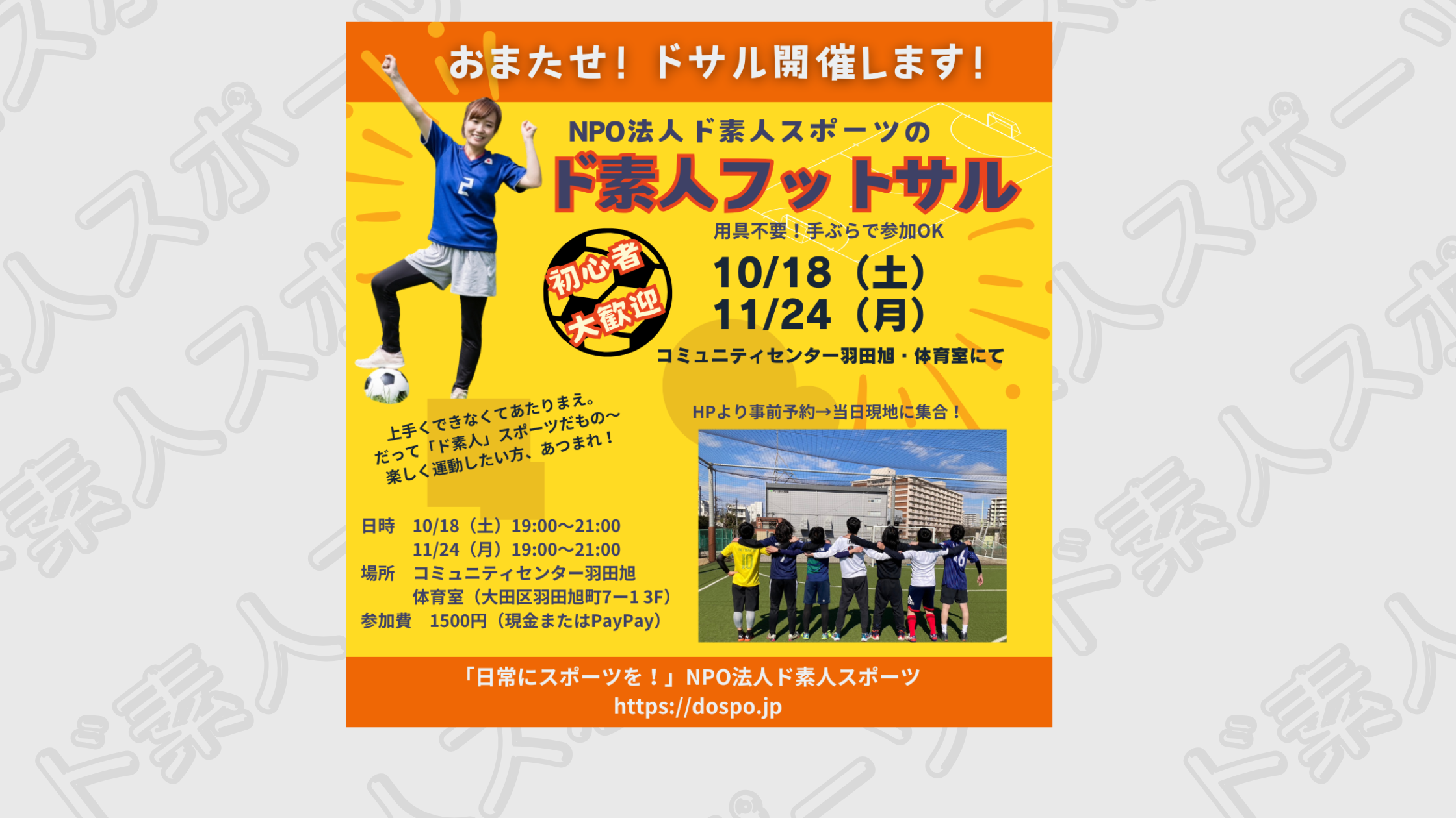 | 当会について | HPをご覧いただきありがとうございます。 当会は1回ごとに参加していただける、東京都大田区・品川区・神奈川県川崎市を中心にしたスポーツプラットフォームです。 年齢・経験・国籍を問わず誰でもスポーツを楽しめる場所づくりを心がけており、練習会の他に各種イベントの開催や地域のイベント参加をしております。 スポーツに興味がある方、運動不足解消したい方、楽しく地域活動をしたい方、プロスポーツ観戦に興味がある方はぜひ一度遊びに来てください! わたしたちの目的・理念については以下もご覧下さい。 https://dospo.jp/free/philosophy |
