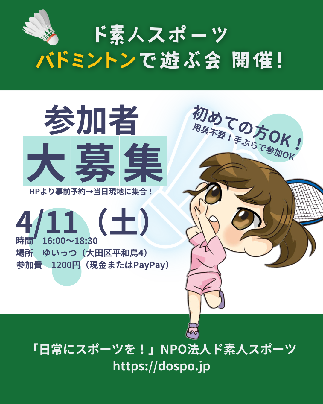 ド素人スポーツ『バドミントンで遊ぶ会』 初心者さんでも大丈夫! 用具不要。室内履きだけ持参して下さい。 試合前にちょこっと打ち方講座あり。 楽しく運動しちゃおう! 次回開催:4/11(土)16:00-18:30 会場:ゆいっつ 【レベル】誰でも 【定員】30名 【練習内容】 アップ→ちょこっと練習→試合(レベル別) 【持ち物】 ・運動出来る洋服 ・室内用の靴 【駐車場】2台まで無料※要事前連絡 ご予約後直接現地へお越しください。